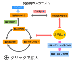 関節痛は、久しぶりに山登りしたとか、病気で長く寝ていて筋力が落ちたというような、何らかのきっかけにより、関節を滑らかに動かす滑膜組織が炎症を起こすことから始まります。滑膜組織が炎症を起こすと、関節が硬くなり、曲げ伸ばしが低下します。また、痛みを伴いようになると、曲げ伸ばしをできる限り避けるようになり、関節はますます固くなります。その結果、痛みがさらに悪化するという「負の循環」が、関節痛には働いていると考えられます。
