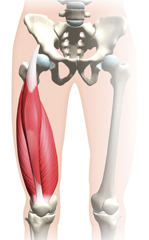 膝周りの筋肉で一番重要なのは、膝を伸ばす働きのある大腿四頭筋(だいたいしとうきん)という太ももの前側の筋肉です。膝を伸ばす構造は、大腿四頭筋、膝蓋骨(しつがいこつ)(お皿)、膝蓋腱(しつがいけん)へと続いていきます。つまり膝を伸ばす構造の中心にある膝蓋骨(お皿)の上下には軟らかいもの(筋肉、腱)が硬いもの(骨)へつながる部分があり、力学的に弱い性質があります。したがって大腿四頭筋の筋力が落ちると、相対的に膝を伸ばす構造への負担が増え、膝蓋骨(お皿)の周りに痛みを感じることとなります。膝蓋骨(お皿)の周りを押すことで、痛みを確認することができます。膝蓋骨(お皿)の周りの痛みをそのままにしておくと、さらに筋力が落ち、痛みも増すという悪循環に陥ってしまいます。