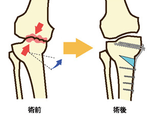 骨切り術は、脛骨の一部を切って脚全体の並び(アライメント)を調整する手術です。脚のアライメントが調整されることで膝の内側に集中していた負荷が分散されるようになり、痛みの軽減を期待することができます。変形が軽度な若い方が適応となることが多くあります。また、関節を温存することで手術後も多くの動作に対応することができ、お仕事やスポーツなど活動性の高い生活を望まれる方を中心に選択されています。