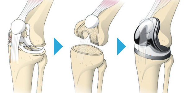 手術には、骨切り術と人工膝関節置換術があります。人工膝関節置換術は、傷んだ太もも(大腿骨)とすねの骨(脛骨)を削り、その部分を金属やポリエチレンでできた人工関節に置き換える除痛効果が期待できる手術です。