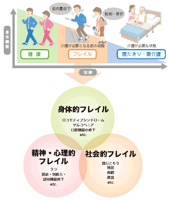 フレイルとは、高齢になるにつれて身体能力が低下し、健康障害を起こしやすくなった状態のことです。健常と要介護の中間的な状態で、日頃の生活習慣によって要介護に進むこともあれば、逆に健常な状態に戻ることも可能な状態です。フレイルには大きく3つの種類があります。1つ目が「身体的フレイル」です。運動器の障害で移動機能が低下したり(ロコモ)筋肉が衰えたり(サルコペニア)するなどが代表的な例です。2つ目が「精神・心理的フレイル」です。高齢になり定年退職やパートナーを失ったりすることで、うつ状態や軽度の認知症などになった状態です。3つめが「社会的フレイル」です。加齢に伴って社会とのつながりが希薄化することによって、閉じこもりや経済的困窮な状態を言います。この3つの要素が悪化すると、フレイルからやがて要介護状態になることがあります。