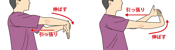テニス肘やゴルフ肘については、多くの場合オーバーユースと加齢による腱の変性が原因のため、まずは痛みの出る動作を避けて安静にします。また、患者さんの症状に合わせたストレッチや筋力トレーニング、セルフマッサージを行います。肘周囲の筋肉を揉みほぐしたり、指を下にして片腕をまっすぐ前に伸ばして反対の手で引っ張るストレッチなどは代表的です。これらのリハビリは、痛みの予防としても大切ですので、プレーの前に習慣づけてほしいと思います。