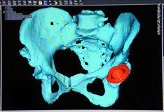 人工股関節は、大腿骨側のインプラントである「ステム」と「骨頭(ボール)」、寛骨臼側のインプラントである「カップ」とその中にはめ込む「人工軟骨(ライナー)」が組み合わさったものです。インプラントの材質は合金ですが、ライナーは多くが医療用の特殊なポリエチレンでできています。人工股関節は、患者さんの骨の形態や大きさ、さらには骨の質に合わせて適正にフィットしたものを選んで入れますが、まずは事前の手術計画がポイントになります。手術が決まったら、CTを撮って骨の形や状態を確認し、その上でコンピュータを使用して3次元的な術前計画を行います。その患者さんに合ったインプラントの種類と大きさ、骨をどの場所で切り、どの位置からどこまで削り、そこにどういう角度でインプラントを設置すればいいかなど、細かいところまで計画を立て、コンピュータ上で手術のシミュレーションを行います。特に関節の変形が強く手術が難しい場合でも、的確なプランニングと手術が可能になります。