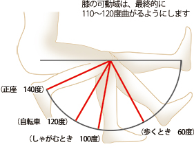 リハビリは手術の翌日から行います。まずは歩行子訓練から始めるのですが、手術直後はまだ麻酔が効いていて痛みもあまりないため、松葉杖や車イスは使用せず、歩行器を使って歩く練習を行います。その後、100度以上まで膝が曲がるように、理学療法士のもとでリハビリしていきます。脚を曲げるときに痛みが出る人もいますので、リハビリは理学療法士が手術した部位の間節をマッサージして柔らかくしてから、可動域を広げるように行っていきます。最終的には、110度から120度ぐらいまで曲がるようにもっていき、2週後には抜糸して退院となります。早い人ですと10日くらいで退院します。男性の場合、「入院していてもやることないから帰ります」と退院される人も珍しくないですよ。女性は心配だからと2週間入院される人が多いですね。