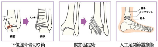 手術療法:関節を掃除する関節デブリドマン、脛骨の下の方で骨を切る下位脛骨骨切り術、⼈⼯⾜関節置換術、足関節固定術などがあげられます