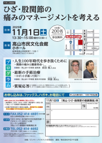講演プログラム | 「ひざ・股関節の痛みのマネージメントを考える」と題し、高山赤十字病院 副院長の前田雅人先生と同院 整形外科部長の齊藤満先生にご講演いただきます。 |
